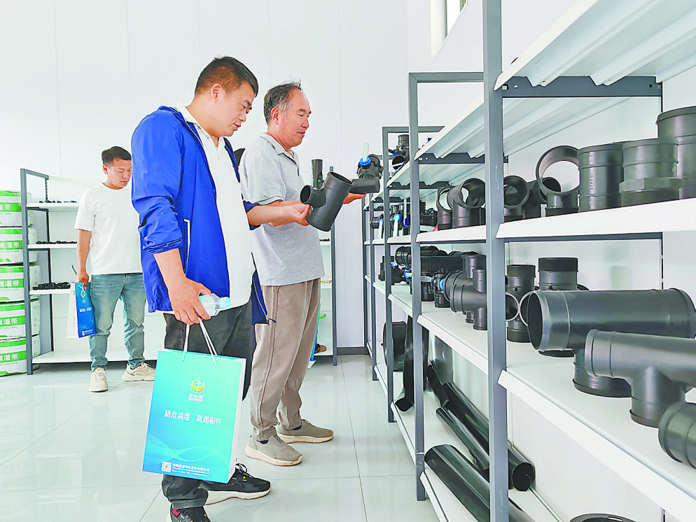4月26日,在武陟县乔庙镇的河南高湖节水设备有限公司展厅,种植大户认真了解滴灌带配套产品。