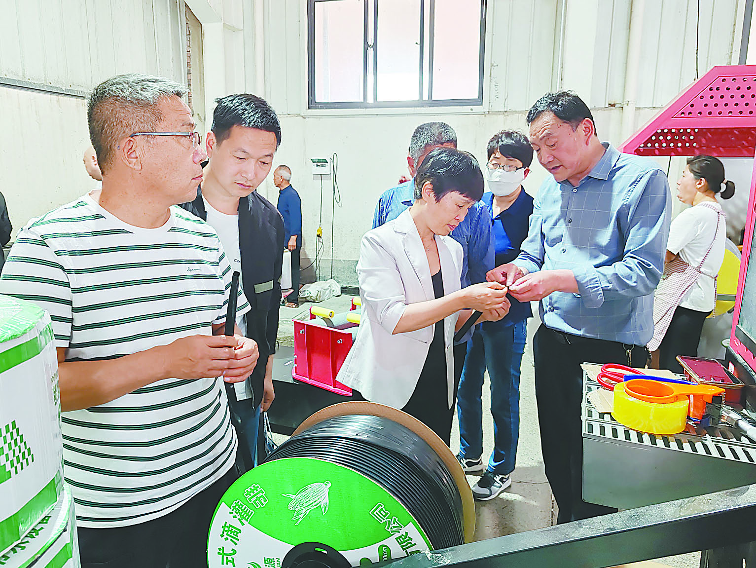 4月26日,农业农村部玉米单产提升工程专家指导组副组长谢瑞芝(前右二)和种植大户参观滴灌带生产车间。